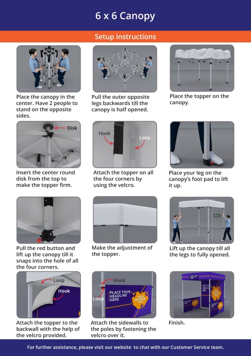 Enhance your custom pop up canopy with essential accessories like a handy wheeled travel bag for effortless transport. A topper attachment equipped with a self-securing closure on the valance's inner edge makes fitting additional features simple. Maintain your canopy's immaculate condition with easy care directions: clean with water, a gentle sponge, and non-detergent soap, and ensure it is thoroughly aired out, ideally under the sun. We also offer bulk purchase discounts and effective shipping options to support your business demands.